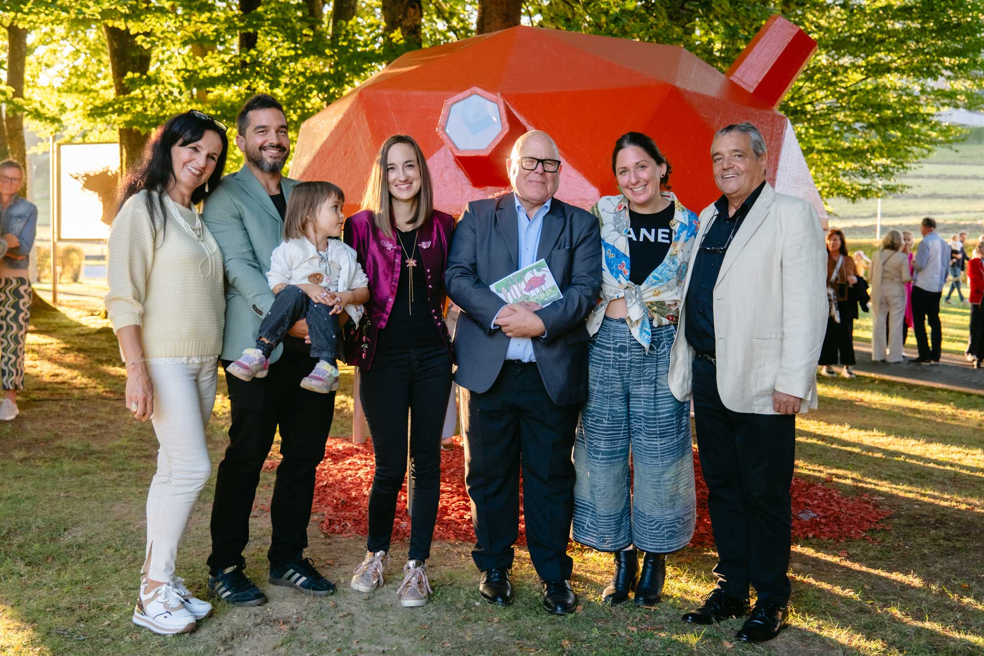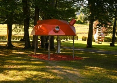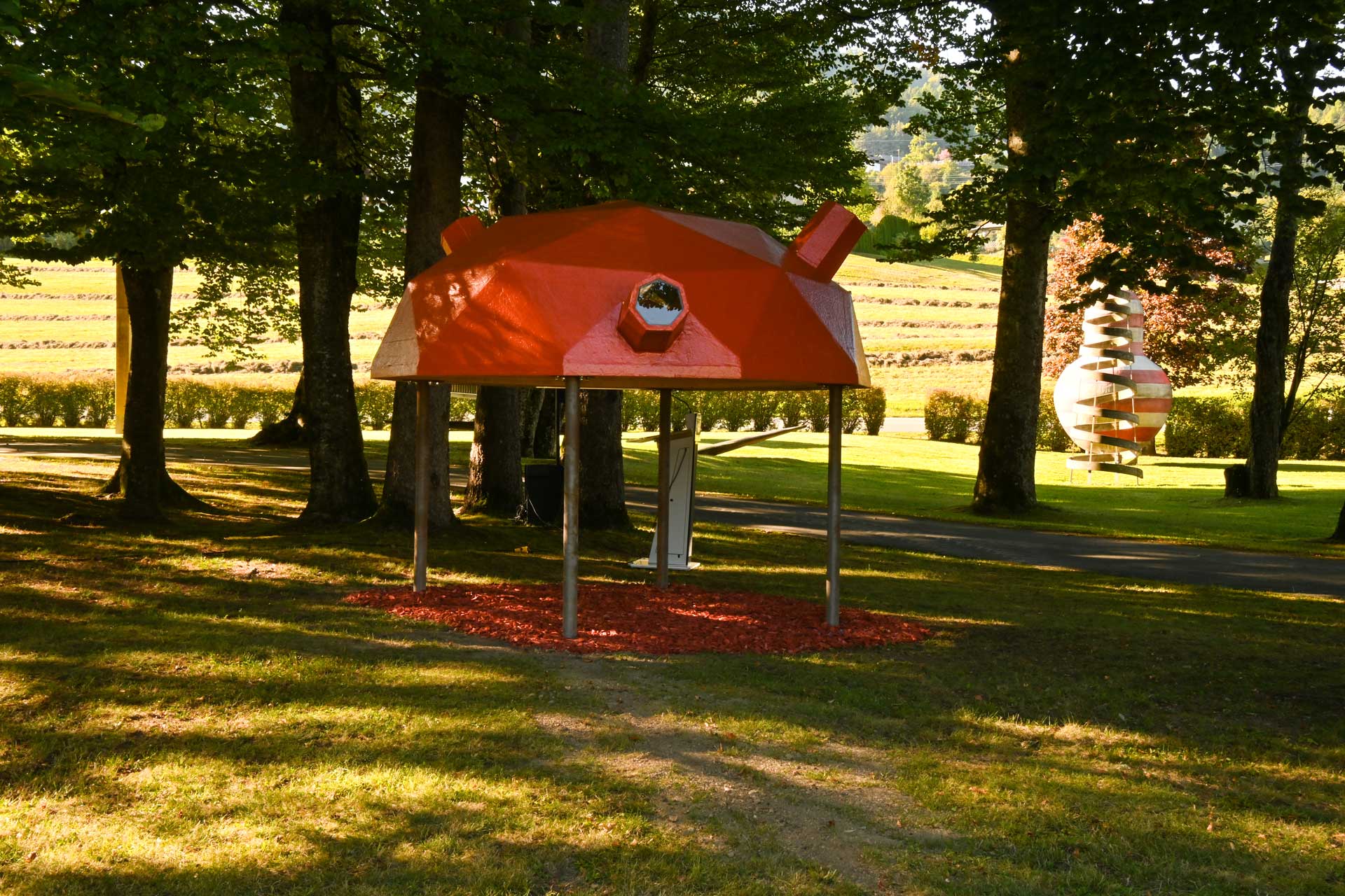 Die kaleidoskopische Skulptur „Alfred“ ist ein begehbares Kaleidoskop, das auf sandgestrahlten Stahlstützen steht. Der verspiegelte Innenkörper und die Blickkanäle (Blickbeine) brechen den Blick, vervielfachen ihn, lassen den Wald, die Bäume, die Umgebung in ornamentale Muster zerfallen. Damit entsteht ein sich ständig wandelndes Bild der Wahrnehmung und der Perspektive. Die Künstlerin bezeichnet „Alfred“ als Schildkröte, ein archetypisches Wesen, das für Schutz, Rückzug und für Transformartion steht und Emotion weckt.